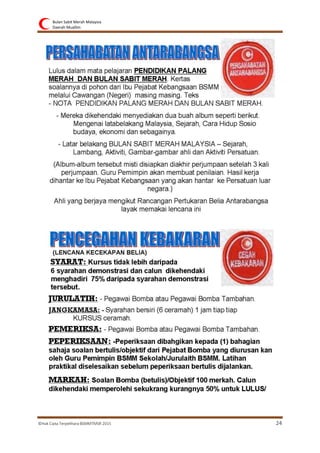 Di Malaysia Persatuan Bulan Sabit Merah Malaysia BSMM bermula pada tahun 1948 sebagai cabang Persatuan Palang Merah Britain di Borneo Utara Britain sekarang negeri Sabah dan Sarawak. Jawatankuasa ini merupakan permulaan Pergerakan Palang Merah dan Bulan Sabit Merah Antarabangsa. KANDUNGAN Indeks Mukasurat -Sijil PBSMM Untuk Sekolah 1 -Sijil Asas.